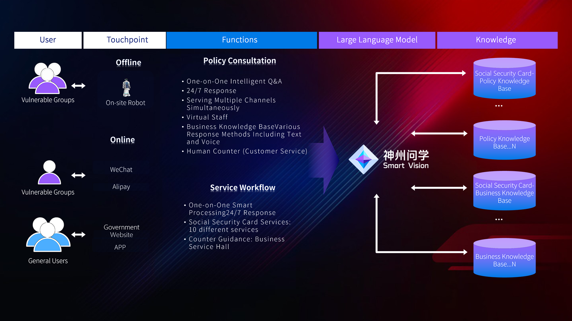 • Comprehensive Online and Offline Coverage: It offers a comprehensive system by incoporating WeChat, Alipay, government websites, and apps, while integrating with robots.