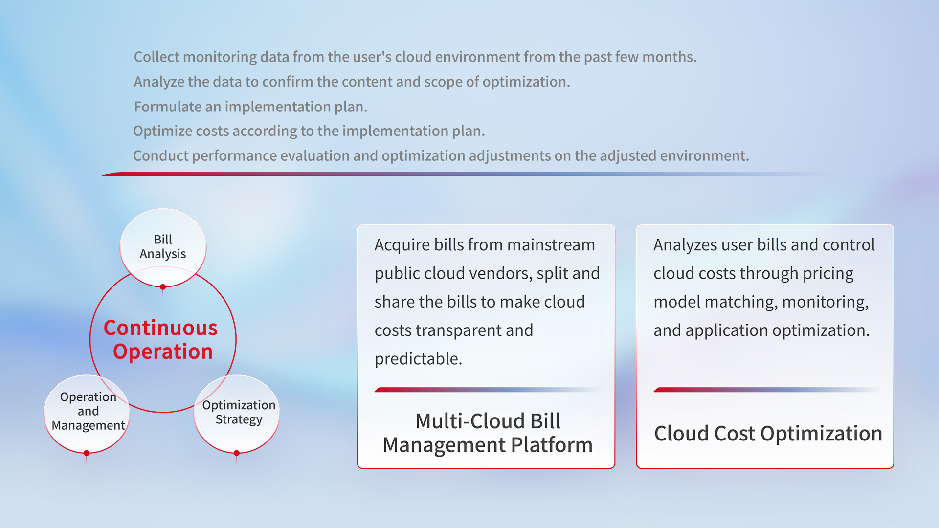 By flexibly utilizing a variety of automated migration tools, we help enterprise users achieve efficient and stable cloud migration and inter-cloud migration. Using our self-developed multi-cloud management platform and a neutral management model, we resolve the complexities of managing multiple organizations, clouds, and vendors. This ensures consistent resource configuration across multi-cloud platforms, real-time control of cloud resource data, and the use of intelligent tools to analyze and manage cloud resources. Costs are managed transparently, with predictable cloud expenses, optimized usage, and well-founded resource quotas.